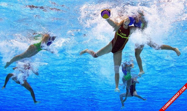 Cảnh đẹp của cuộc chiến tranh bóng giữa các cô gái trong bộ môn bóng nước