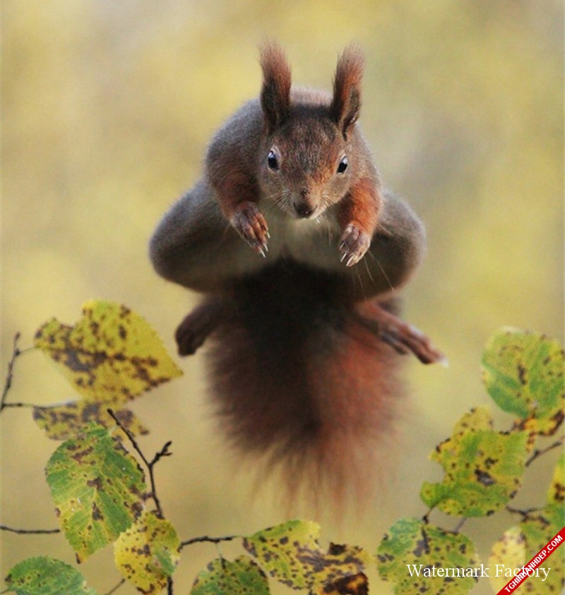 Cú nhảy qua nhánh cây của sóc béo