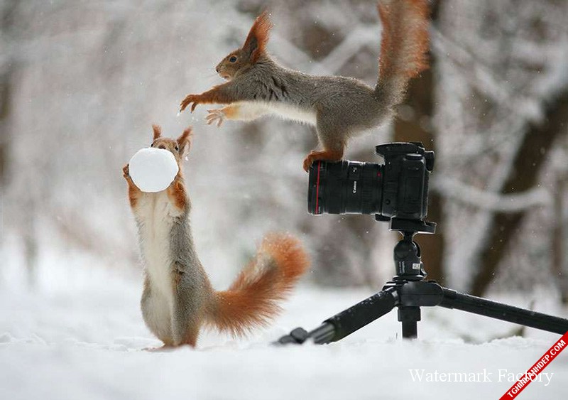 2 chú sóc chơi đùa với quả cầu tuyết bên cạnh máy ảnh