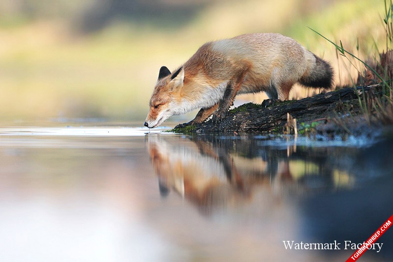 Sói đỏ rón rén uống nước ở bờ sông