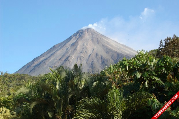 Hình nền phong cảnh dành cho máy tính: Ngọn núi lửa hùng vĩ giữa cánh rừng